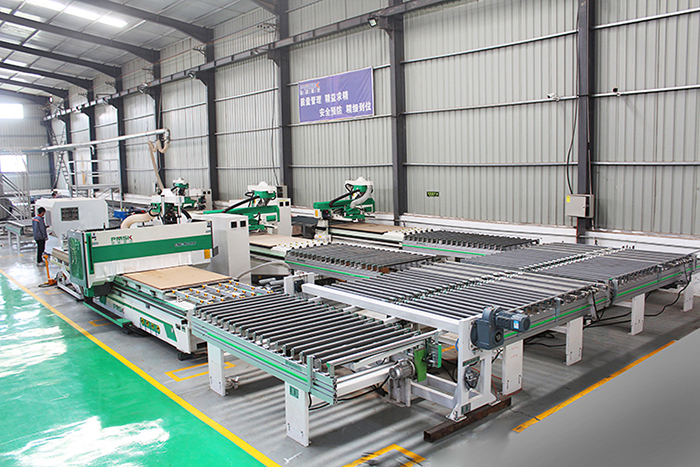 品脈模壓門(mén)板生產(chǎn)線(xiàn)采用1拖4(1拖3或1拖2)的搭配方式,是針對于模壓門(mén)板批量化生產(chǎn)的自動(dòng)化解決方案。主要實(shí)現在門(mén)板背面完成自動(dòng)貼標(或激光打標),打鎖孔,玻璃門(mén)加工。整板翻板、分配、輸送到正面加工機器,完成門(mén)板正面造形加工。完成后機器自動(dòng)把材料傳送到下料臺上,由人工或機械手分撿,日產(chǎn)量可達到280-320平方。