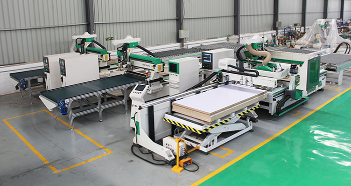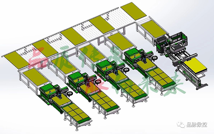 叉車(chē)上料→自動(dòng)貼標或激光打標簽→機器抓料輸送到臺面上打鉸鏈孔、拉直器槽、玻璃門(mén)背面加工→傳輸到翻板機翻板→自動(dòng)傳輸到高精度絲桿門(mén)板加工中心→加工門(mén)形并切割→加工完傳送到下料平臺。