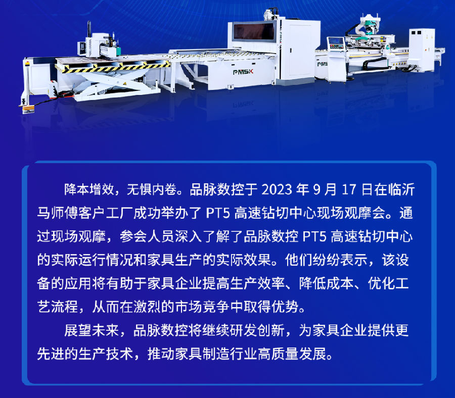 臨沂馬師傅家居有限公司是一家專(zhuān)注于板式家具制造的公司。2023年4月的臨沂展會(huì )期間訂購了品脈數控的PT5高速鉆切中心。此前,馬師傅工廠(chǎng)使用著(zhù)開(kāi)料機、封邊機和側孔機進(jìn)行生產(chǎn),每天的產(chǎn)能只有40張板。然而,伴隨著(zhù)訂單量的增加,工廠(chǎng)的產(chǎn)能遠遠達不到生產(chǎn)需求。為了解決這個(gè)問(wèn)題,馬總決定擴充更新設備。馬總偶然間看到了我們的PT5高速鉆切中心的加工視頻,并對其加工模式產(chǎn)生了濃厚的興趣。于是,馬師傅在今年四月份前往臨沂展會(huì ),通過(guò)詳細了解PT5的生產(chǎn)模式和設備優(yōu)勢之后,決定訂購該臺設備。該設備于五月份正式投產(chǎn)使用。投產(chǎn)后,馬師傅工廠(chǎng)的日產(chǎn)能從原先的40張板增加到了現在的140張板,產(chǎn)能提高了3倍多。并且PT5整臺設備只需要一個(gè)人工便能夠輕松操作,大大降低了人工成本、生產(chǎn)成本,實(shí)現了效率翻倍。